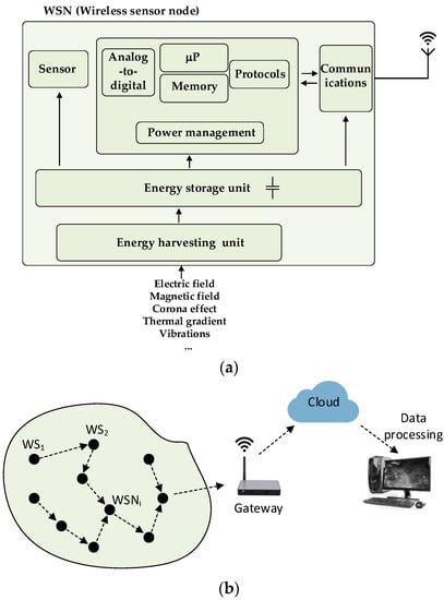 (a) Basic structure of a wireless sensor node (WSN). (b) Structure of a wireless sensor network, adapted from [].