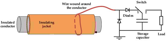 In [], a wire wound around an insulated single-phase 3-wire 220 V cable was used to harvest energy from the stray electric field, generating 680 nW on average. A sketch of this EH system is shown in Figure 5.