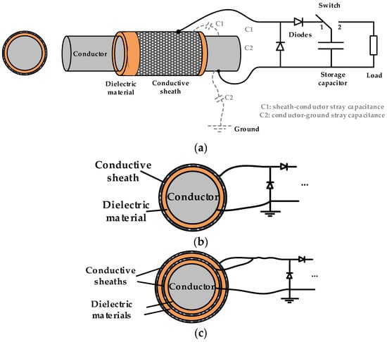 Electric-field energy harvesting concept in power conductors, adapted from []. (a) Schematics of the energy harvester. (b) Single-layer structure. (c) Two-layer structure.