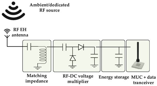 As shown in Figure 7, a conventional RF EH circuit includes an antenna to convert the incoming RF signal into a voltage difference or vice versa, a rectifier to convert the high-frequency signal to DC, a voltage multiplier that produces a higher DC output voltage, and an energy storage device, such as a battery or a supercapacitor [].