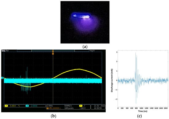 Corona discharges in a needle-plate geometry (needle diameter = 0.8 mm, needle tip-to-ground distance = 70 mm, 60 kPa, 3.6 kV, 50 Hz). (a) Photograph of the corona discharge in the tip of the needle. (b) Voltage (yellow) and current (blue) waveforms during the corona discharges. (c) Detail of a corona discharge as seen in the electrical current pattern.