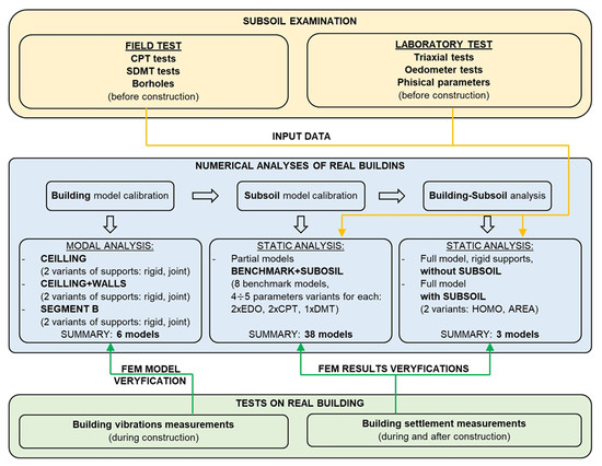 The present work describes the process of conducting a three-dimensional analysis of cooperation between a real building located in Lublin in eastern Poland and loess soil it is founded on. Research included studying the soil and the structure, numerical modelling and geodetic measurements. The final results are the product of subsequent iterations adapting model parameters to the actual behaviour of the objects. Figure 1 shows a graphical representation of the overall analysis.