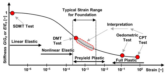 To describe the behaviour of the subsoil, parameters that are derived in various types of subsoil studies are needed. Soil parameters determined by different methods can differ significantly [19,20,21]. One of the most important features of soil is its deformability, which shows a strong non-linearity and is variable depending on the range of deformations considered. The maximum soil stiffness is expressed by the initial shear modulus G0 and is associated with deformability in the range of very small deformations. As deformations increase, soil stiffness decreases with a non-linear relationship, as illustrated in the diagram by Atkinson [22,23]. This relationship, referred to as soil stiffness degradation curve (the so-called S curve), is presented in Figure 2 along with ranges of deformations for typical structures and the selection of appropriate research methods depending on the range of deformations. Studies on the deformability of Polish soils in a wide range of deformations have been described, inter alia, in [24,25,26,27,28]. Soil stiffness is the lowest in the limit state, i.e., at deformations of about ε = 0.1%.