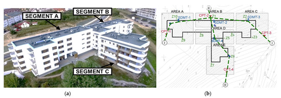 The research concerned a large multi-family building with four floors above the ground and one underground, located in Lublin (Figure 3a). The entire building consists of three segments, separated from each other by movement joints at the foundations, arranged in the shape of the letter T. The horizontal dimensions are about 90 × 45 m. The object is located on a small slope, so each segment is lowered by half a floor in relation to the previous one. Segment A is the highest; the adjacent Segment B is lowered by half a floor, and Segment C is lowered by half a floor in relation to Segment B, and by one floor in relation to Segment A. The building has a mixed reinforced concrete and masonry structure. Walls are 25 cm thick, while reinforced concrete floors are 20, 22 and 30 cm thick. The building is founded on reinforced concrete footing and reinforced strip footing.