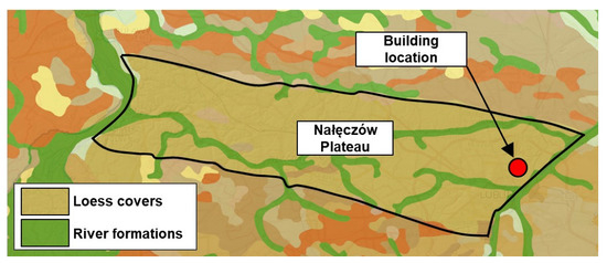 Lublin is located in the area of the Nałęczów Plateau with loess covers (Figure 4). Basically, only in the valleys there are river formations from the ground level. In the uplands there are mainly loess soils, which are the basis for the foundations of buildings.