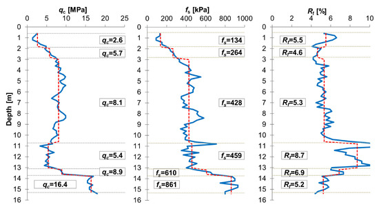During CPT tests, qc—tip resistance and fs—sleeve resistance are measured, which are the basis for determining other geotechnical parameters. The most important parameter for the purposes of the analysis was the constrained modulus MCPT, which was determined from the formula defined by Sanglerat [35]: