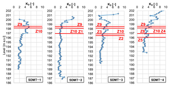 As far as SDMT tests are concerned, the most significant values for the purposes of the present analysis were the dilatometric constrained modulus MDMT, which was calculated using the Marchetti formula [41] and the lateral stress coefficient KD used to assess soil preconsolidation. These parameters are shown in Figure 6.