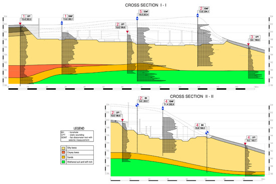 In order to determine soil characteristics, laboratory tests (among other, oedometric and triaxial compression tests) and field tests (CPT and SDMT) were performed, the location of which is shown in Figure 3b. A selected representative CPT chart is presented in Figure 5, and a detailed description of field tests can be found in [34].
