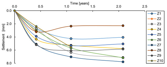 The displacement graph (Figure 9) indicates settlement stabilisation for most points. The largest displacement was recorded on benchmarks in the extreme parts of the building from the side of the slope (Z3, Z6, Z7), which may suggest a slight tilt of the building in this direction. For these points, the shape of the curves indicates that stabilisation of the building settlement has not occurred yet. The benchmark Z8 in the central part of the building is noteworthy, as according to measurements, it was elevated by about 1 mm. According to the author, this is probably related to the fact that the building is leaning towards the slope and to a kind of “break” at the point of expansion joints, and thus a possible rise of the building in the central part. Negligible elevation values recorded on nearby benchmarks Z1, Z5 and Z9 may confirm this hypothesis, but according to the author, they may just as well result from measurement errors and attest to settlement stabilisation.