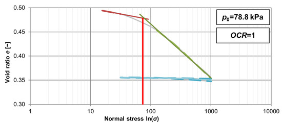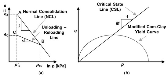 After a review of the works [50,51,52,53,54], Modified Cam-Clay was chosen as the subsoil model. Its basic assumption is that for the primary load, there is a logarithmic relationship between the mean effective pressure p0 and the porosity index e (isotropic Normal Consolidation Line—NCL). NCL described as the compression index on the lnp’-e plane is a straight line with a slope of λ. The final stress level ever achieved on this line is called isotropic preconsolidation pressure ppo. [55,56,57]. During unloading and reloading up to preconsolidation stress, there is a line with slope of κ, referred to as unloading-reloading index. In reality, on the p’-e plane, there is an infinite number of recompression curves - secondary load curves, each of which corresponds to a specific ppo value [51,58]. Plane p’-e is shown in Figure 10a.