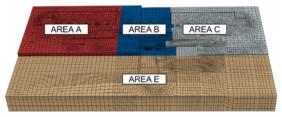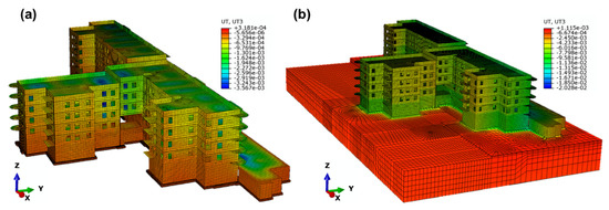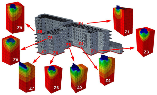 After calibration on small models, two variants of parameters were adopted for the subsoil in the full model (Table 6). In the first variant, HOMO, constant parameters were adopted for the entire subsoil. In the second variant, AREA, the subsoil was divided into computational areas (Figure 14) and soil parameters were assigned to them in accordance with in situ tests from these areas. For homogeneous subsoil, the mean of the parameters for particular areas was adopted. Moreover, calculations were performed in the RIGID variant for the model of the building without subsoil—with rigid supports. The meshing for the full model started from the building. A mesh with sides of approximately 0.2 m was adopted, starting its creation from the smallest elements of the building. In the subsoil, in the zone of contact with the building, a mesh of similar dimensions, about 0.2 m, was used. Along with the depth and distance from the building, the dimensions of the mesh were increased. In the deepest parts of the subsoil, a mesh with dimensions of up to 3.6 m was used. Standard geotechnical boundary conditions were used to block horizontal movement perpendicular to the plane on the sides and vertical movement at the base of the subsoil mass. The full “building-subsoil” model was made up of 218,532 finite elements: solid, plate and beam elements with the dimensions of the subsoil element ranging from 0.2 to 3.6 [61]. In total, the model consisted of 502,224 nodes with 1,921,455 degrees of freedom.