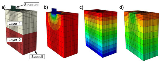Ground deformations have a major impact on the distribution of forces in a structure. In order to properly design a built structure, it is extremely important to reliably represent the behaviour of the subsoil underneath. Recent years have seen a very intensive development of analysis using the Finite Element Method (FEM). Due to the availability of more efficient machines, it is possible to make calculations for every larger model in much less time. Today’s design practically does not exist without using FEM, so it is important to share experiences and the results of such calculations in order to better calibrate models and obtain more reliable results. The interaction between built structures and the subsoil is often analysed as a two-dimensional issue, e.g., for a selected cross-section of the structure [1,2,3]. For axially symmetrical problems, a section of the structure can be used [4]. Three-dimensional models of buildings are the most reliable. However, many analyses are often limited to foundations and based on the assumption that there is a rigid subsoil underneath, or described with one-parameter stiffness [5,6,7]. Sometimes subsoil mass is modelled with a small fragment of the structure [8,9]. Three-dimensional analysis of a building with subsoil is a complicated and laborious issue, but it is the most reliable one [10,11,12]. Sometimes analyses are performed over a larger area, e.g., for a development concept [13] or a larger site stability analysis [14].