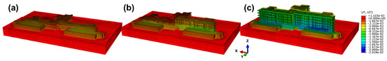In the analysis, subsequent fragments of the building were gradually applied to the model, in accordance with the actual construction stages. The calculations were divided into 13 steps similar to the calibration models, starting from Geostatic and Footing. Then, in 9 steps: Underground (a ÷ c), Load 0 (a ÷ c) and Load 1 (a ÷ c), the geometry of the building was introduced. In the last two steps, Load 2 and Load 3, additional load was added for phase 2 and 3 respectively from Table 1. Figure 15 shows the displacements of the model in the AREA variant in selected calculation steps. Figure 16 shows the vertical displacements of the RIGID and AREA models.
