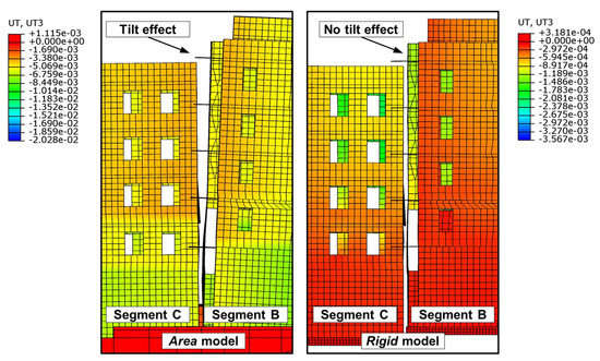 A comparison of the minimum principal stress maps [kPa] at the garage entrance in segment A in the AREA and RIGID models.