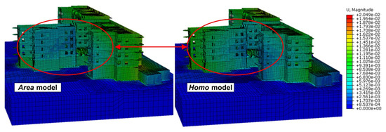 A comparison of maps of resultant displacements [m] of the building in the AREA (left) and HOMO (right) models.