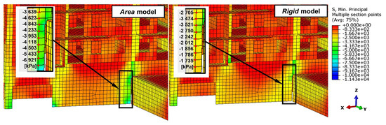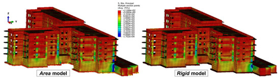 Comparison of the minimum principal stress maps [kPa] of the building in the AREA and RIGID models.