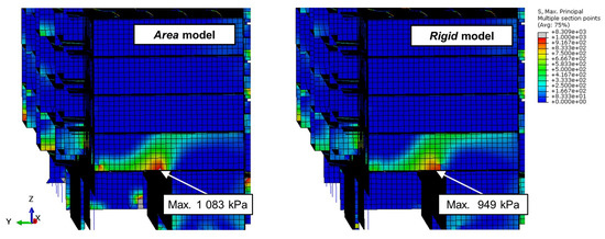 A comparison of the maximum principal stress maps [kPa] in a selected reinforced concrete deep beam of segment A in the AREA and RIGID models.