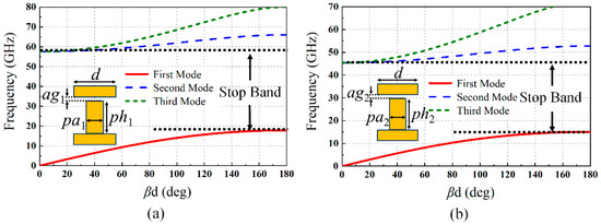 To design the GW components with the desired operating frequency ranges, we used the eigenmode solver of CST Studio, commercial full-wave simulation software, to obtain the dispersion diagrams for unit cells of the EBG structures. It can be seen from Figure 2 that the stopbands emerged in the Ka-band and K-band for the two respective parallel-plate structures. Optimized dimensions of these GW units were found to be pa1 = pa2 = 0.9 mm, ph1 = 2.4 mm, ph2 = 3.1 mm, ag1 = ag2 = 0.1 mm, and d = l.9 mm.