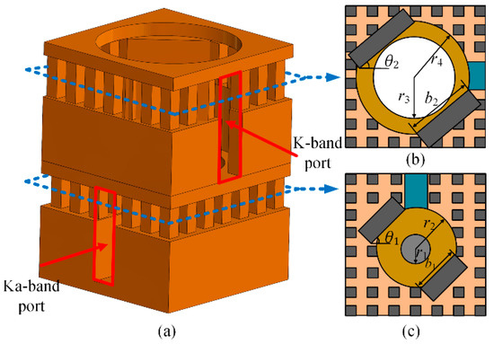 Illustration of an antenna unit. (a) 3D view of the antenna unit showing the stacked structure. (b) Sectional view of the K-band cavity. (c) Sectional view of the Ka-band cavity. The parameters of the antenna unit follow: r1 = 1.4 mm, r2 = 3.3 mm, r3 = 4.75 mm, r4 = 5.4 mm, b1 = 3.44 mm, b2 = 6.4 mm, θ1 = 46°, and θ2 = 37°.