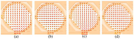 The field distributions inside the Ka- and K-band cavities at different time steps within one period T are shown in Figure 4 and Figure 5, respectively. It can be seen that the E-field vectors are periodically rotated by 90° after each T/4 interval in the respective frequency band inside both cavities. The electric field vectors rotate clockwise at Ka-band and counterclockwise at K-band, which means LHCP and RHCP are realized at different frequency bands.