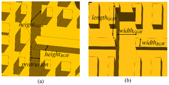 Figure 7a shows the topology of the RGW-to-GGW power dividers used in the feed network. The protrusion at the end of the RGW can be used to optimize the input reflection coefficient of the power divider. Figure 7b shows the topology of the GGW-to-RGW dividers. The distance between the RGWs and the shorter end of the GGW is around λg/4, where λg is the wavelength of the guided wave in the GGW. This distance is chosen to generate the maximum E-field value at the crossing point between the GGW and RGWs to excite the parallel RGWs. It should be noticed that the RGWs have no protrusion in a GGW-to-RGW power divider structure. The dimensions of the RGW-GGW transitions are summarized in Table 1 and Table 2.