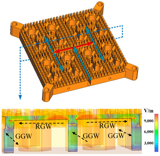 Figure 8 shows the electrical field distribution of a section of the feed network that contains both GGW-to-RGW and RGW-to-GGW transitions. The out-of-phase field distribution in the two RGW sections to the right and to the left of the crossing point with the GGW can be clearly observed. To compensate for the 180° phase difference without having to use any additional phase shift lines, the output GGWs are placed back to back, which cancels the 180° phase difference. As a result, sixteen radiation units are uniformly excited with the same amplitude and phase.