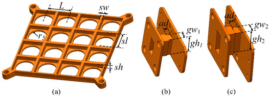 Grid layer and input-port transitions of the proposed antenna. (a) Waffle-grid layer. (b) Ka-band transition. (c) K-band transition. The parameters of the waffle grid and waveguide transitions follow: r5 = 5.5 mm, sl = 11.5 mm, sh = 2.5 mm, sw = 1.5 mm, ad1 = 1.8 mm, gw1 = 3.36 mm, gh1 = 8.12 mm, ad2 = 2.8 mm, gw2 = 4.3 mm, gh2 = 10.6 mm.