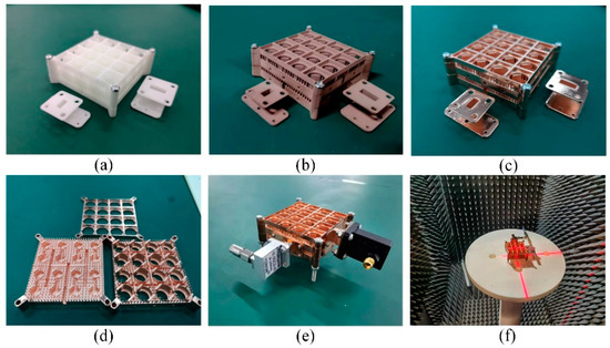 Fabricated antenna array prototype. (a) SLA-printed prototype. (b) Surface-metalized prototype. (c) Surface-polished prototype. (d) Unassembled parts. (e) Fully assembled antenna structure. (f) Measurement setup.