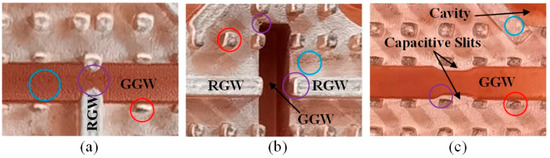 Figure 11 illustrates a sample of some crucial parts of the prototype array. Surface roughness due to the SLA printing and metallization are visible as ripples that can be seen in several places (see blue circles in Figure 11). However, since the surface of the prototype was polished, such ripples are merely 1 μm thick, and their effect is negligible. In addition, the right-angle corners of metallic pins and RGWs became rounded corners when fabricated (see purple circles in Figure 11), which have also been taken into account in the simulated model. Capacitive slits placed in a GGW for improving the impedance matching can be seen in Figure 11c. Because of fabrication error in the vertical dimension, the metallic pins may not have exactly the same height (see red circles in Figure 11). As mentioned in Section 2, the air gap between the pins and the top metallic plate is intended to be 0.1 mm. Since this distance is much less than a quarter of a wavelength, slight variations in the air gap do not affect the EBG characteristics. Even if the pins are in contact with the top metallic plate (e.g., air gap = 0 mm), the gap waveguide would degenerate into a laminated waveguide with quasi-closed geometry [31], which can also act as an EBG structure.