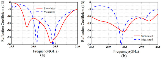 The S-parameters of the fabricated array were measured by using an Agilent vector network analyzer (E8363B). Figure 12 shows the measured and simulated reflection coefficients of the proposed antenna. The measured input reflection coefficients are below −10 dB within the bandwidths 19.91–20.72 GHz (3.9%) in K-band and 28.22–29.19 GHz (3.5%) in Ka-band. The corresponding impedance matching bandwidths acquired from simulation results are 19.76–20.77 GHz and 27.45–29.41 GHz for the K- and Ka-bands, respectively. While the measured bandwidths are smaller than the simulated values, both measurements and simulations show reasonable agreement, especially on the response of the antenna prototype in the upper region of the two frequency ranges. The discrepancy observed between the measurement and simulation results may be attributed to fabrication tolerance and imperfections that resulted from the 3D printing and metallization processes. Figure 13 shows the measured and simulated coupling levels between the two ports of the antenna structure. The measurement and simulation results show that a high level of isolation (>35 dB) between the two ports is realized over the two frequency bands. This is partly due to the stacked structure that allows the K-band and Ka-band arrays to be at different layers.