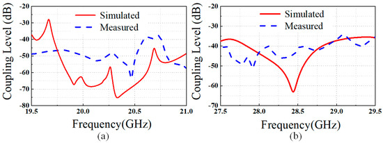 Simulated and measured inter-port coupling level versus frequency. (a) S12 for lower frequency band. (b) S21 for higher frequency band.
