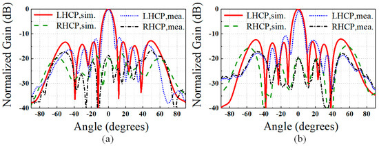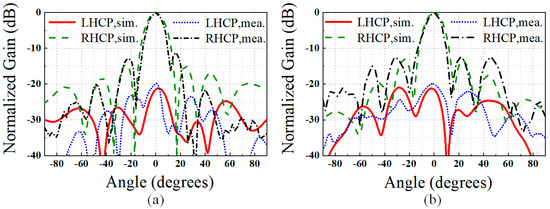 The far-field radiation patterns of the antenna were measured in an anechoic chamber, as shown in Figure 10f. Figure 14 and Figure 15 present the simulated and measured normalized radiation patterns of the array in the x–z and y–z planes at 20 and 28.5 GHz. Overall, the measurement results are in good agreement with the simulation results. In the x–z plane, the 3 dB beamwidths of the RHCP and LHCP beams are 14° and 13°, respectively, and the sidelobe levels are lower than −13.3 and −12.2 dB, respectively. The patterns in the y–z plane are similar to those obtained for the x–z plane. Figure 16 shows the simulated and measured axial ratios (ARs) as functions of frequency over the lower and higher operating bands. The 3 dB AR bandwidths determined from the measurements are 19.89–20.52 GHz (3.1%) and 28.26–29.31 GHz (3.6%), which mostly overlap with the −10 dB impedance matching bandwidths for both bands. A noticeable difference can be seen between the simulated and measured results in a small fraction of the higher band for frequencies below 28.5 GHz. This can be caused by multiple factors, including fabrication error and measurement uncertainty of the far-field characterization system.