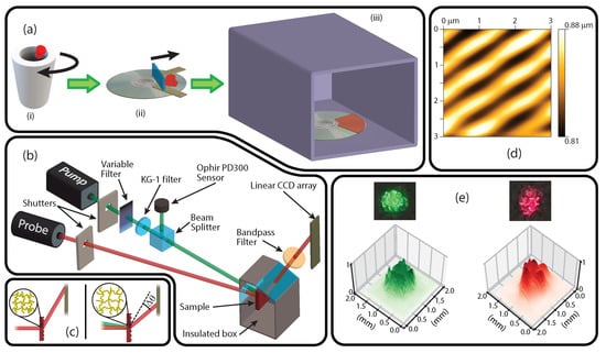 For pump power measurements, the pump and probe lasers were aligned so that both beam spots were centered on the same location over the surface of the film. Figure 1e shows images of the pump and probe laser spots and topological profiles after Weiner noise filtering. Both the nm pump and nm probe beams were in operation for more than 10 min prior to any experimentation so that they could reach a temperature equilibrium and stabilize the output power. The pump beam was passed through a variable density filter to control the pump power. Infrared light with a wavelength of nm was removed from the pump beam with a KG-1 filter. Shutters were used to toggle the pump and probe beams on/off. As shown in Figure 1b, a beam splitter sent some of the pump to a reference detector and let the rest of the beam pass through to the polycarbonate window and illuminate the dye-doped PDMS sample.