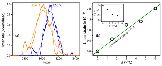 The linear strain as a function of temperature change is shown in Figure 2b. From Equation (4), the slope of the graph gives the linear coefficient of thermal expansion. The value of ppm/C quoted by the technical data sheet [103] is within the experimental value of ppm/C determined by linear regression with the line being constrained through the origin. The grating period shifted nm, but the method has a high degree of sensitivity owing to the diffracting beam acting as an optical lever. A polymer with a typical coefficient of thermal expansion of an order of magnitude less than PDMS can also be measured with the same precision by simply increasing the arm length of the optical lever (propagation length of the diffracted probe beam) by an order of magnitude.