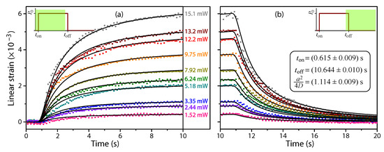 Plots of the strain as a function of time for many values of the pump laser power . The solid lines are fitted to the entire data set for all pump powers and during both the illumination and dark periods. The fitted lines all share the same values for , , and . The insets illustrate the square pump pulse with the two boxed regions showing the period of data collection when the shutter is (a) opened and (b) closed.