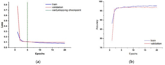 Figure 8 shows the training and validation accuracies and losses during the training. Table 9 shows the performance comparison of the proposed methodology with other studies. Compared to previous studies, our study showed significant performance improvements in sensitivity and specificity indicators when classifying COVID-19 and non-COVID-19 images. Compared to Elpeltagy at el. [19] who conducted experiments on the same dataset as ours, the model proposed in this study showed significant performance differences in precision and specificity before the five-fold test. After a five-fold test measuring the stability of the model within a small data set, the models showed significant performance differences in accuracy, precision, specificity, and the F1-score. The results of applying the proposed methodology to COVID-19 and non-COVID-19 X-ray imaging classification studies were effectively confirmed.