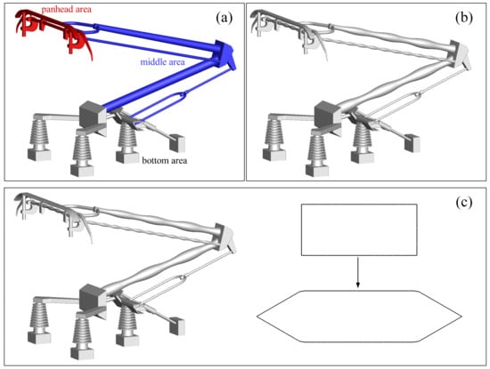 Schematic diagram of the three pantograph models: (a) original model; (b) wavy rod model; (c) hexagonal strip model.