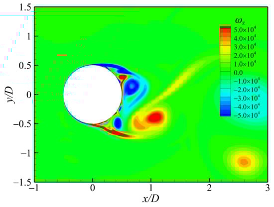 Figure 5 shows the instantaneous contour of spanwise vorticity. The boundary layer separates at the lateral sides of the cylinder and generates the shear layer, which rolls up to form the vortex street structure. The vortex shedding causes unsteady force and generates aerodynamic noise. A standard observer is arranged at . Table 3 compares the maximum value of sound pressure level and corresponding Strouhal number . It indicates that the present hybrid method can simulate the noise intensity and capture the dominant frequency.