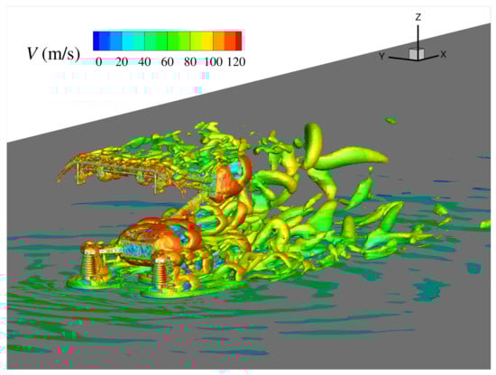 Turbulent eddies are an important flow structure for the noise generation. They evolve gradually along the flow direction. Figure 6 provides the instantaneous iso-surface of the Q-criterion, which is colored by the velocity magnitude. As can be seen, eddies generated by the panhead are small and they are elongated in the x direction when flowing downstream. The air flowing through the bottom area of the pantograph produces the large-scale eddies, of which the position increases as they flow downstream. The large-scale eddies merge with eddies in the wake of the middle area and the panhead area.