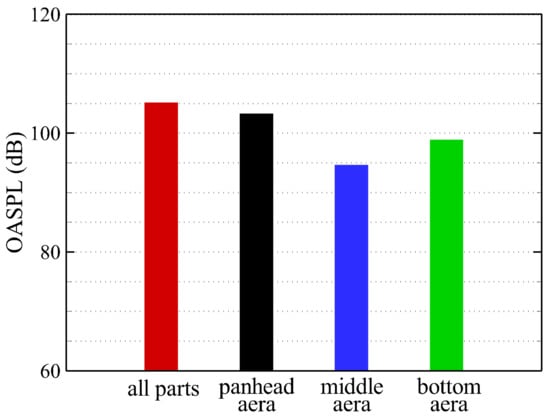 In order to study the far-field noise radiated from the original model, a standard observer point is selected, and its coordinates are (0, 25, 3.5) m. The time history of the sound wave is divided into three parts, namely the noise radiated from the panhead, middle, and bottom areas. Figure 9 compares the overall sound pressure level (OASPL) of the noise radiated from different parts, and the OASPL values are 105.12 dB, 103.29 dB, 94.61 dB, and 98.87 dB, respectively. It is found that the noise intensity of the panhead area is obviously higher than the other two parts, which is consistent with the qualitative analysis based on the pressure fluctuation contour shown in Figure 7. In addition, the far-field noise is also calculated using a finer grid of 43 million cells. The OASPL value of the noise radiated from all parts is 104.99 dB, indicating that the grid independence is well satisfied.