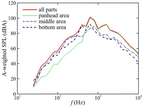 The value is close to the result in Ref. [24]. By comparing the contribution of different parts to the total noise, it is found that the noise radiated from the middle area is close to that of the bottom area, apart from the peak frequency of the former being lower than that of the latter. In the high-frequency range (), the spectrum value of noise radiated from the panhead area is larger than the noise radiated from the middle and bottom areas. However, the noise radiated from the panhead area is weaker than that from the other two parts in the low-frequency range ().