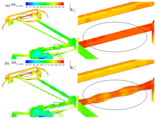 According to the previous research [15], the boundary layer separation of the wavy cylinder is markedly delayed and the noise intensity can be suppressed. In order to study the influence of wavy rods on the aerodynamic noise of the pantograph, the surface pressure level is firstly compared in Figure 11. Through modifying the cross bar surface, the value of the pressure time derivative is obviously decreased, as marked by an ellipse. Applying the wavy rods can also reduce the acoustic source in the middle area, but the reduction magnitude is relatively small, such as in the lower arm frame.