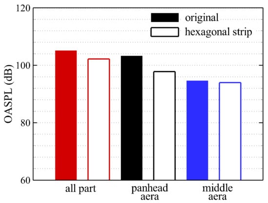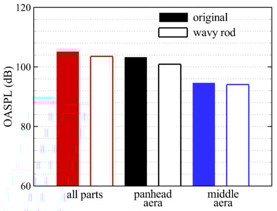 Next, the values of OASPL at the standard observer are quantitatively compared in Figure 12. The components of the bottom area remain the same, so the corresponding noise intensity is not displayed. As shown in Figure 12, the noise generated by the middle area of the wavy rod model is slightly weaker than that of the original model, and the difference is about 0.6 dB. Then, we focus on the noise radiated from the panhead area of the two models. The difference between the two models is 2.4 dB, and the results suggest that applying the wavy rods can diminish the panhead noise intensity. Furthermore, the change of A-weighted SPL at different frequency ranges is studied. The data in Figure 13 reveals that the panhead noise suppression is mainly concentrated around the peak frequency, from 560 Hz to 3600 Hz. Nevertheless, the noise intensity in the higher frequency range ( 3600 Hz) is strengthened.