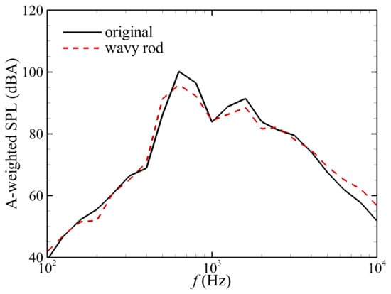 A-weighted sound pressure level spectra of noise radiated from the panhead of the original model and wavy rod model.