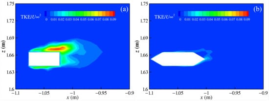 Contour of non-dimensionalized turbulent kinetic energy (TKE): (a) original model; (b) hexagonal strip model.
