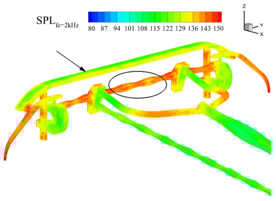 Furthermore, the A-weighted sound pressure level spectra (A-weighted SPL) of noise radiated from different parts are presented in Figure 10. The peak frequency of the total noise is 630 Hz, and the characteristic length scale L according to Aeolian tone characteristic is