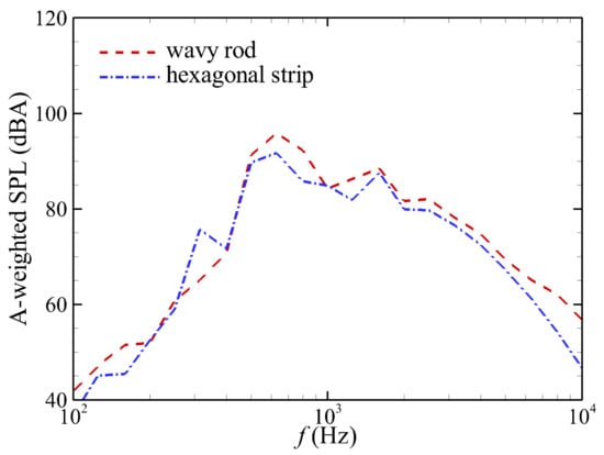 A-weighted sound pressure level spectra of noise radiated from the panhead of the wavy rod model and hexagonal strip model.