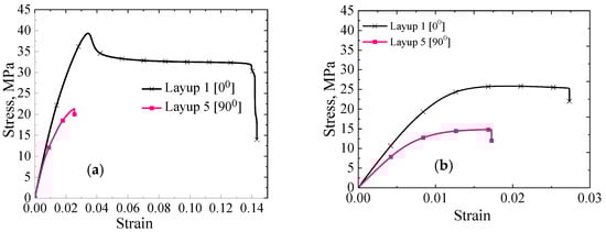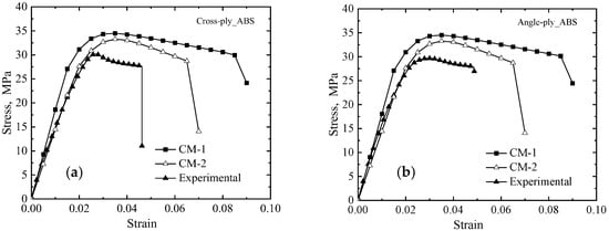 Stress–strain relation for 3D-printed parts made of ABS material for: (a) cross-ply and (b) angle-ply printing strategies.