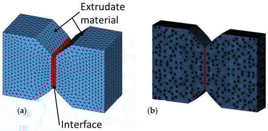 The main differences between the previous computational method and this method are the FE modelling of RVEs and nonlinear material data. In this case, the FE models of RVE have a different material (red region) for the interface of extrudates, and this considers the debonding failure mode. For nonlinear material data, it employs tensile testing data of unidirectionally 3D-printed parts (with 0° printing direction) for extrudates and the test data of printed parts (with 90° printing direction) for the interface material. The tensile testing data is considered to account for the predominant failure modes, debonding and breakage of extrudates in 3D-printed parts. 3D-printed parts with 0° printing direction experienced only breakage of extrudates, and in the case of the parts with 90° printing direction, they experienced only debonding at the interface of extrudates. The tensile test data of the above two cases can capture the actual failure behaviour of 3D-printed parts. The tensile testing data of unidirectionally 3D-printed parts from Figure 4a is utilized for computational modelling of the parts made of ABS polymer, and Figure 4b for modelling the parts made of composite material. Furthermore, implementing actual test data in the computational models eliminates several assumptions made in the previous case, including imperfect bonding at the interface and no pores within extrudates. This procedure makes the computational model realistic. Further, the method allows for the prediction of the nonlinear behaviour of 3D-printed parts accurately.