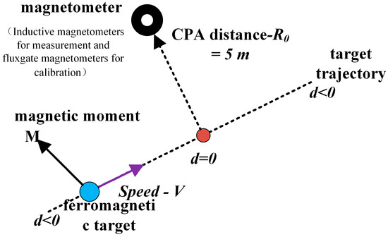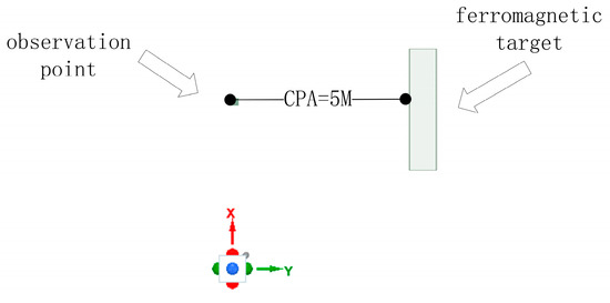 In this paper, a moving target detection model was used under a 50 Hz geomagnetic field. For this model, a ferromagnetic target 5 m long, 1.9 m wide, and 1.4 m high was placed in the model. The relative permeability was 1000. A simulated power frequency background field was constructed, which had a similar intensity to the measured one as well. An observation point was placed 5 m away from the target CPA, as shown in Figure 1: